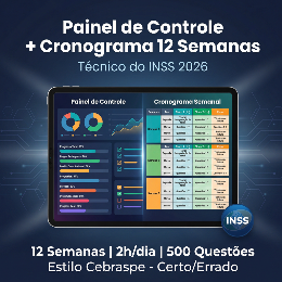 Você recebe o cronograma completo dia a dia (o que estudar, quantas questões fazer, quando revisar) + um painel de controle em Excel para acompanhar seu progresso em tempo real.